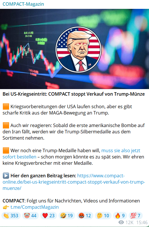 ➡️ Aber auch dem System das Compact mit Wahlwerbung für die AFD unterstützt und aufwachende Menschen von Handeln abhält im dem es falsche Hoffnungen verbreitet.
