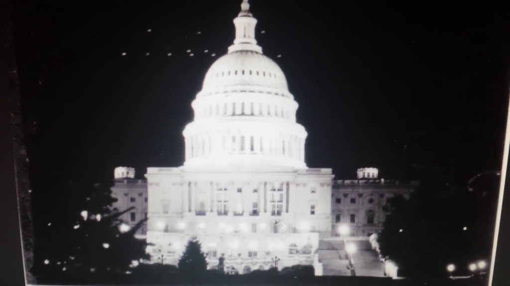 Eines der bekanntesten ist jenes in dem ein Geschwader von Ufos über Washington zu sehen sein soll! Von diesem Bild sind viele Varianten im Umlauf, aber sie zeigen immer nur den oberen Teil des Bildes. Wer das ganze Bild betrachtet erkennt schnell das die angeblichen Ufos nur eine Spiegelung der Lichter sind