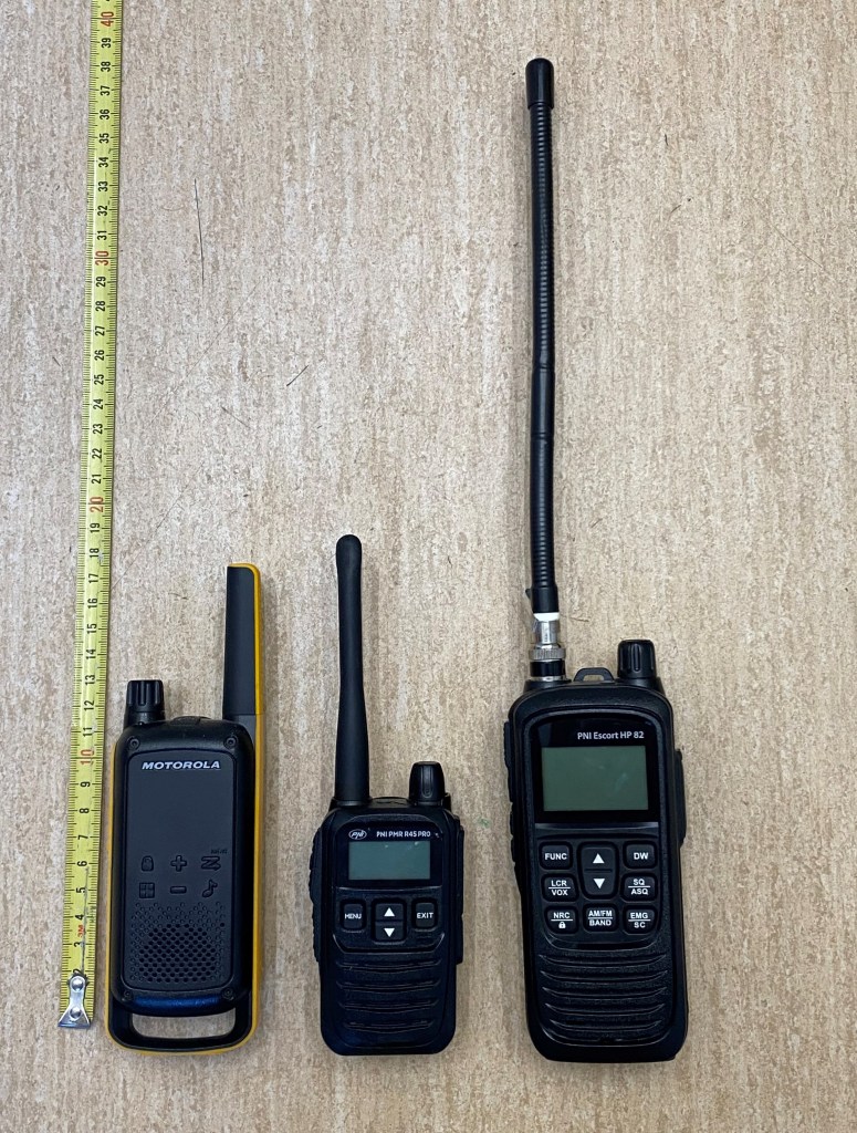 PMR Funk nutzt die UHF Frequenz bei 446 MHz. Die Geräte sind auf 0,5 Watt gedrosselt.