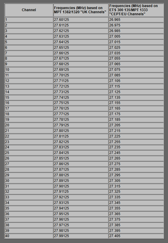 Besonders interessant sind die Englischen CB Frequenzen auf den Multinormgeräten. Diese liegen versetzt zwischen 27,6 bis 27,9 MHz, im sogenannten „Schwarzfunkbereich“.