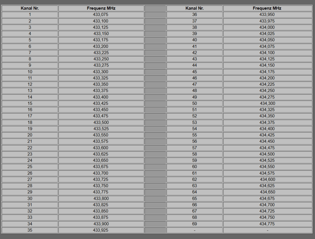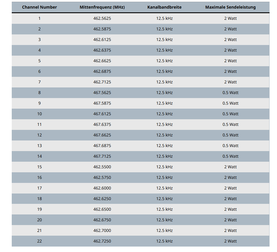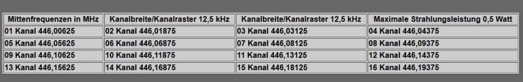Kanal 1 liegt hier zb auf: 446,00625 MHz. Einige Geräte lassen sich jedoch umstellen auf die sogenannte „Export“ Variante welche dann bei 3 bis 5 Watt liegt. 446 MHz liegt im 70cm Band. Obwohl die Leistung viel geringer ist als bei CB Funk kommt man auf ähnliche oft sogar höhere Reichweiten in der Stadt weil die 70cm Wellen besser Häuser durchdringen. Stahlbeton macht ihnen jedoch wieder größere Probleme als Kurzwellen. Wobei hier auch jeder Funker unterschiedliche Erfahrungen macht!